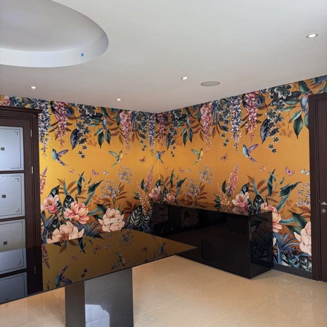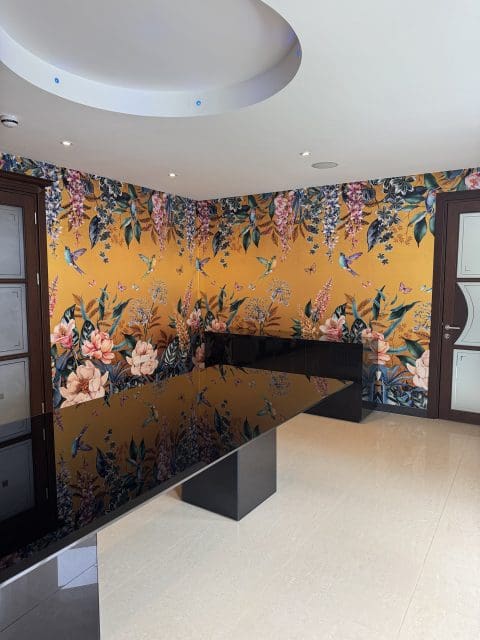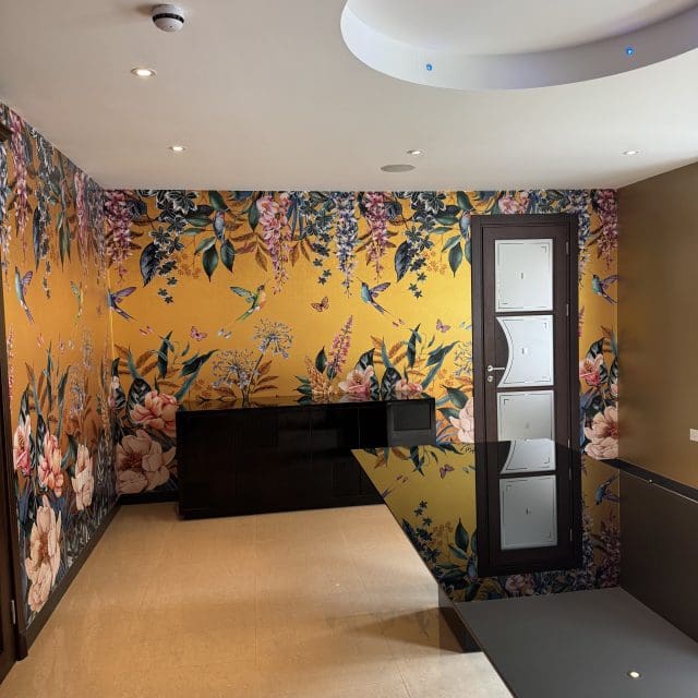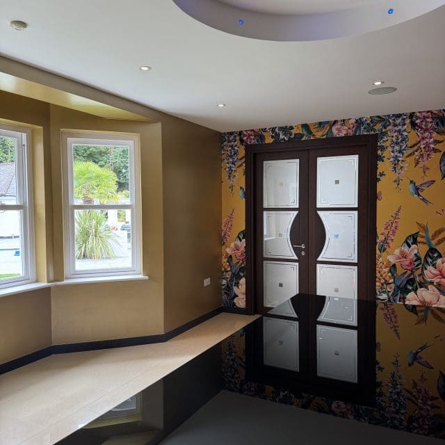 This dining room in Longfield was transformed into a bold and eye-catching space through a combination of high-quality decorating and precise wallpaper installation. The room features a striking, large-scale botanical wallpaper that required careful alignment around corners, doors, and architectural details. We prepared all surfaces thoroughly, ensuring a smooth base before hanging the paper to achieve a flawless, seamless finish.
