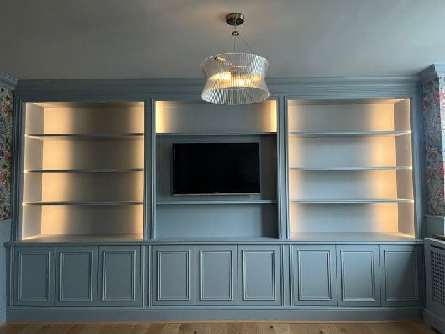 To enhance the look and function of the shelving, we integrated soft LED lighting within each section. This creates a warm, inviting glow in the evenings and highlights the craftsmanship of the unit itself. The lighting also adds depth to the room, making the space feel brighter and more refined.