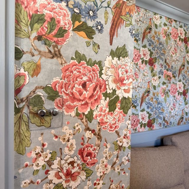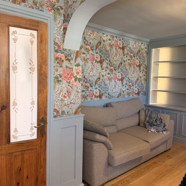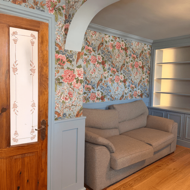 The walls surrounding the unit were finished with a carefully chosen patterned wallpaper. We prepared the surfaces thoroughly before installation, ensuring a flawless finish with perfectly aligned seams. The wallpaper brings texture and character into the room, balancing the clean lines of the cabinetry with soft, decorative detail.